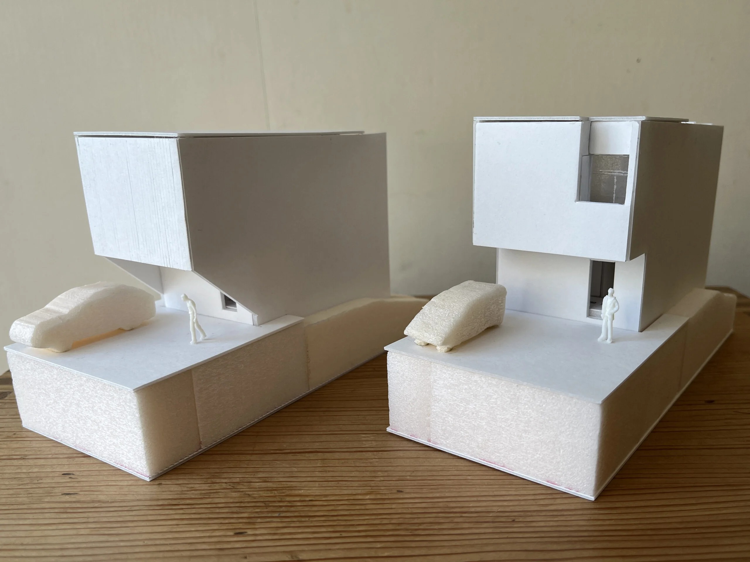 1/100模型 2023.01.012022.12.17宮田です。五月丘の家のプレゼン模型2パターン。敷地内に1階分の高低差がある傾斜地での計画です。 道路側から見ると二階建ての建物ですが、 道路の反対側は地階部分が埋まっているのがわかる三階建ての住宅です。 こちらが南面になり、眺望をいかして開放的になっています。 地階がRC造、地上2階が木造の混構造の予定です。 これから基本設計を詰めていきます。