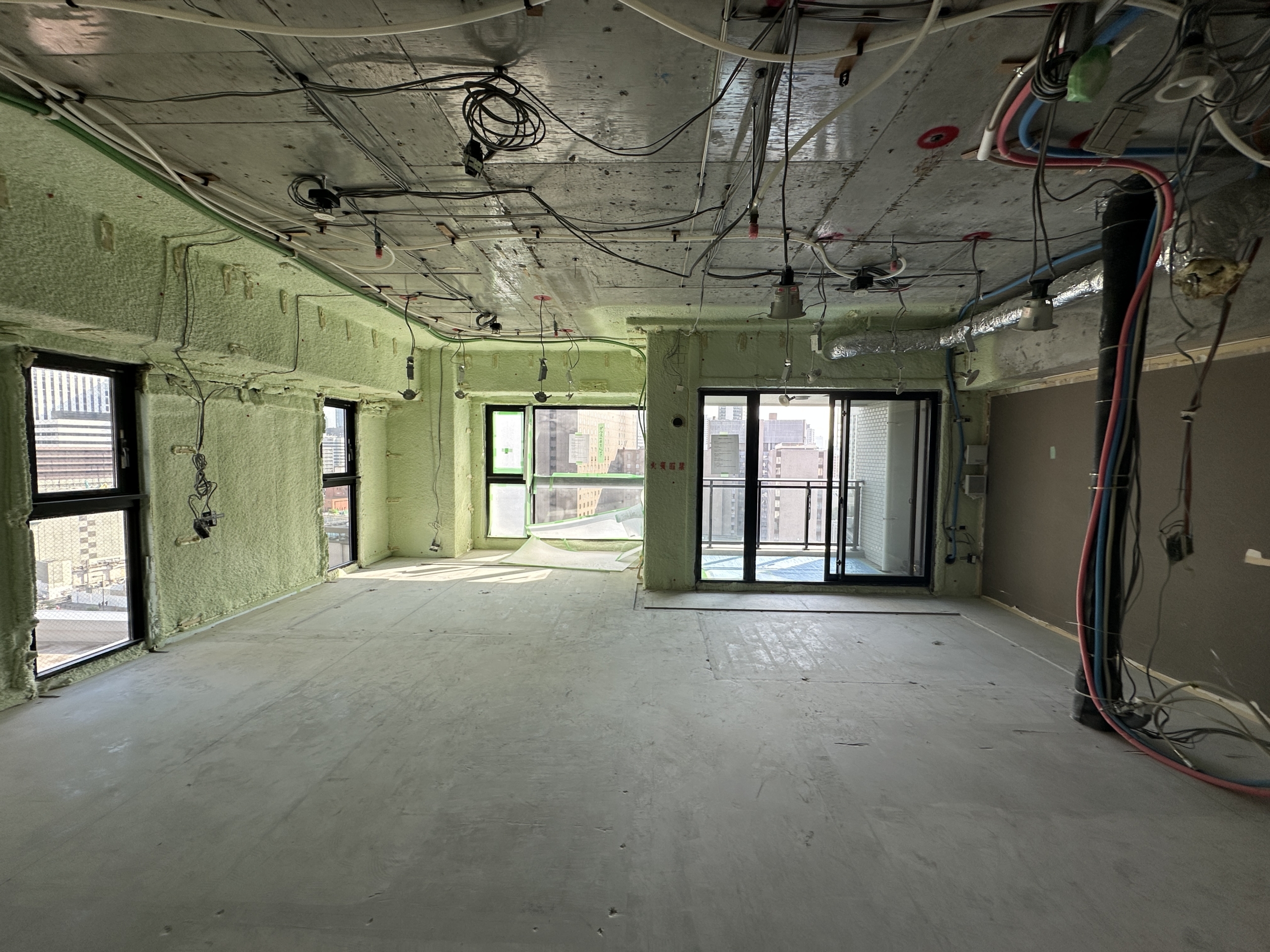 写真のように、天井の配線やダクト、断熱の吹き付けが露わになり、これから新しい空間をつくり込んでいく“素の状態”がよく分かります。