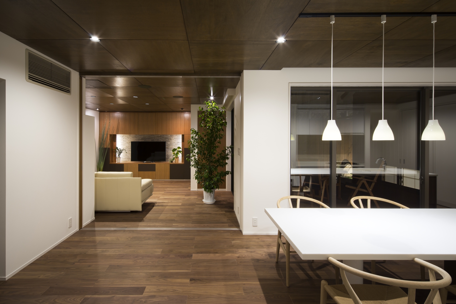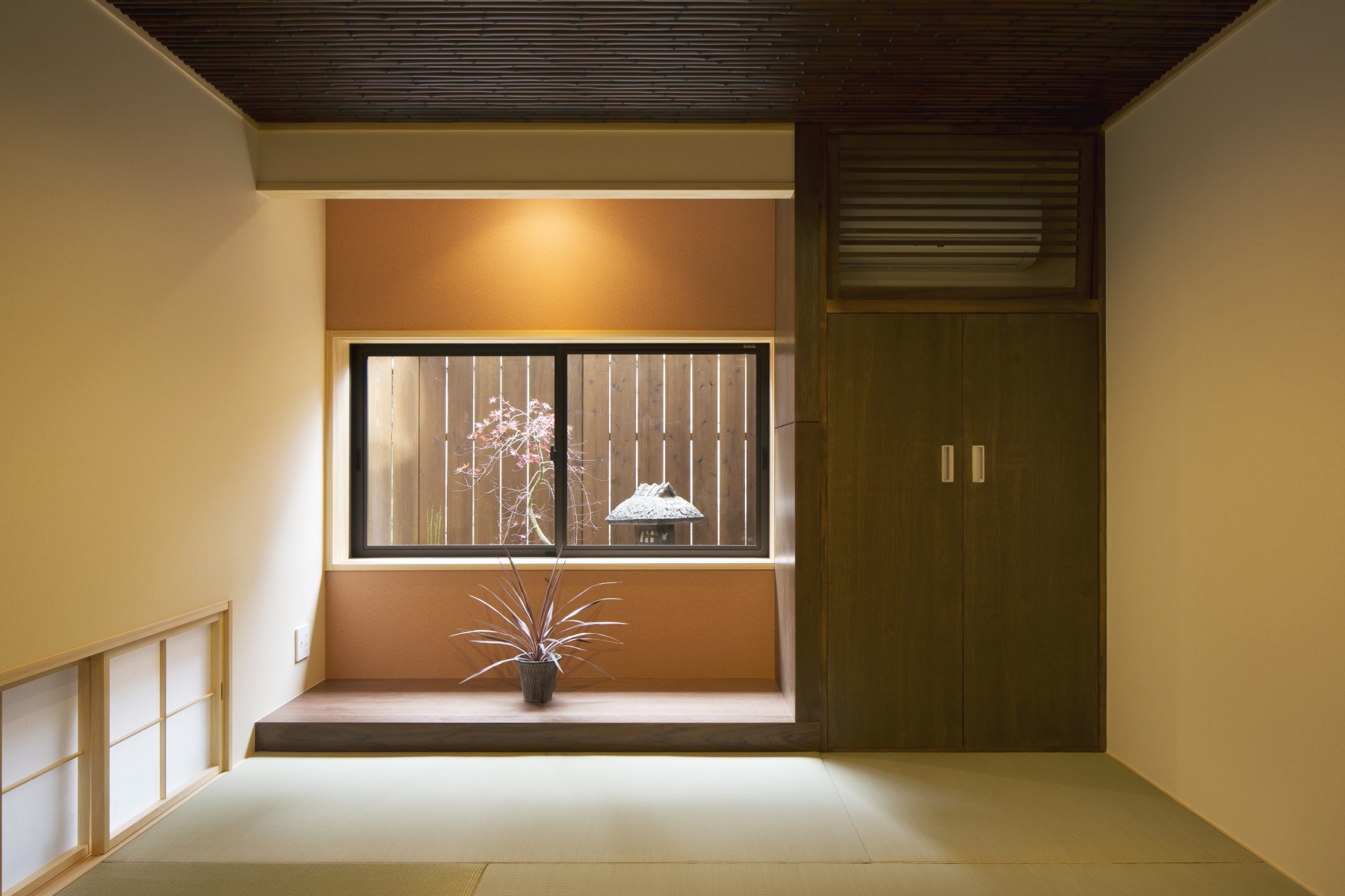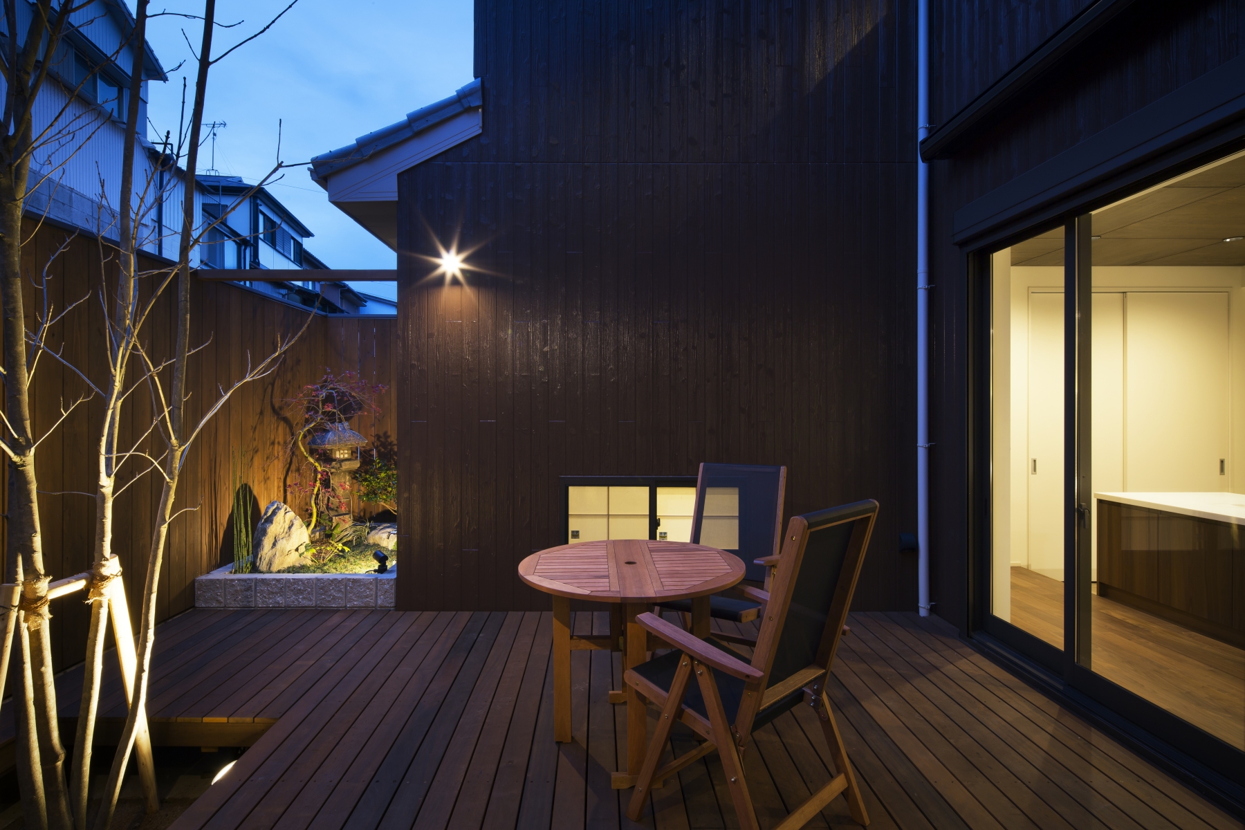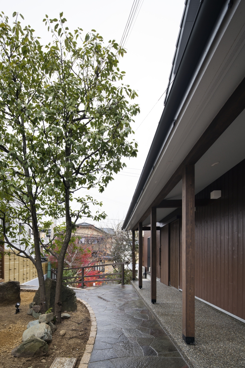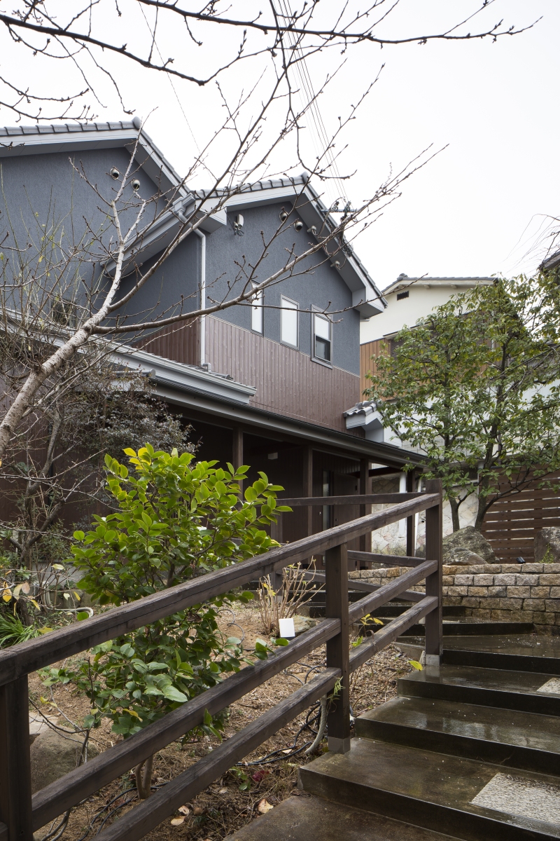 建築主から求められたことは大きく3つ。料亭の雰囲気ある庭やアプローチを活かしてほしい。二世帯の距離感を付かず離れずに設計してほしい。住居としての環境を整えてほしい。