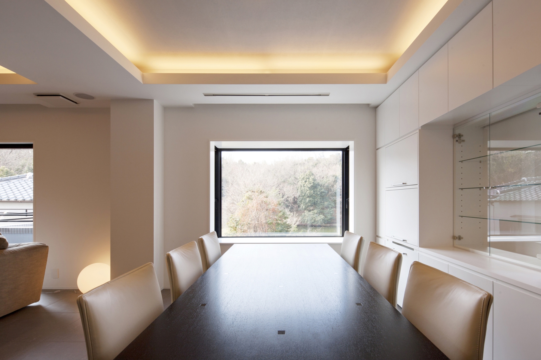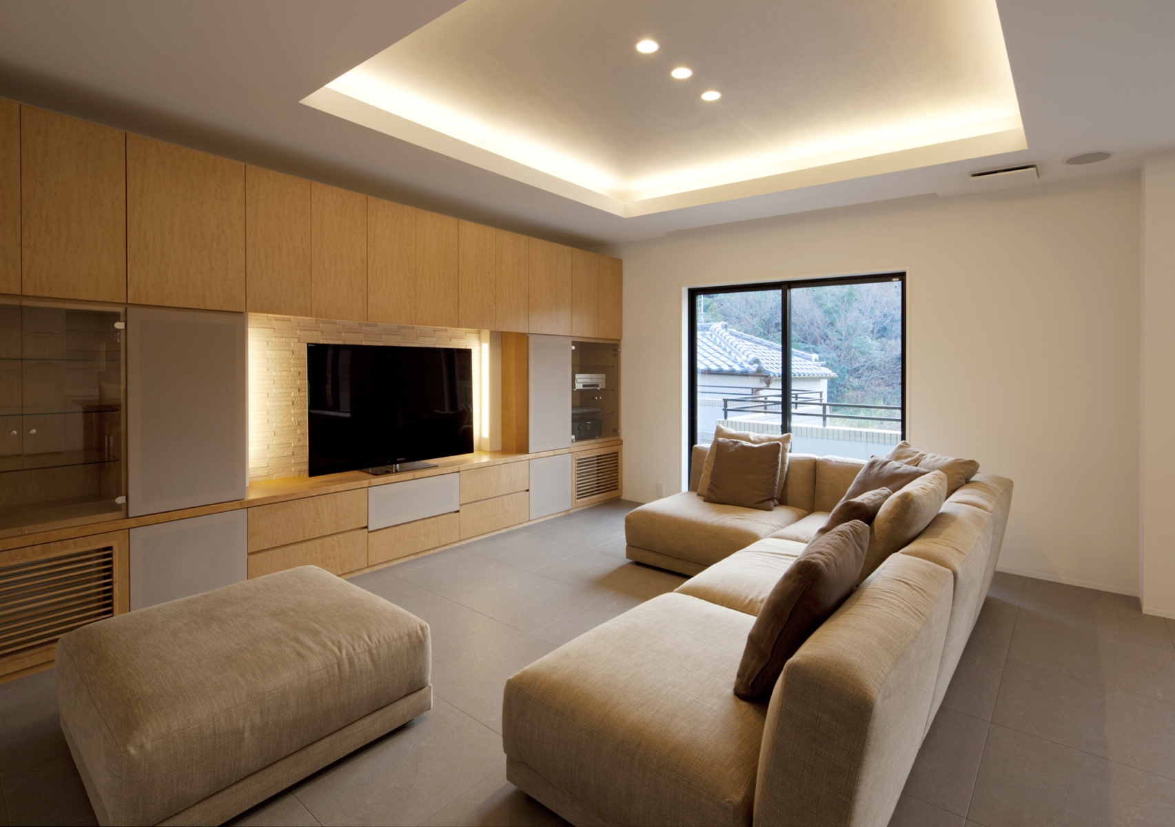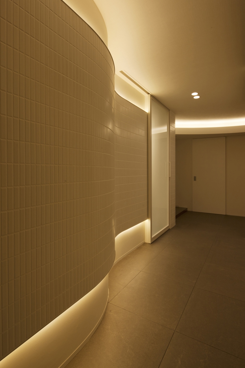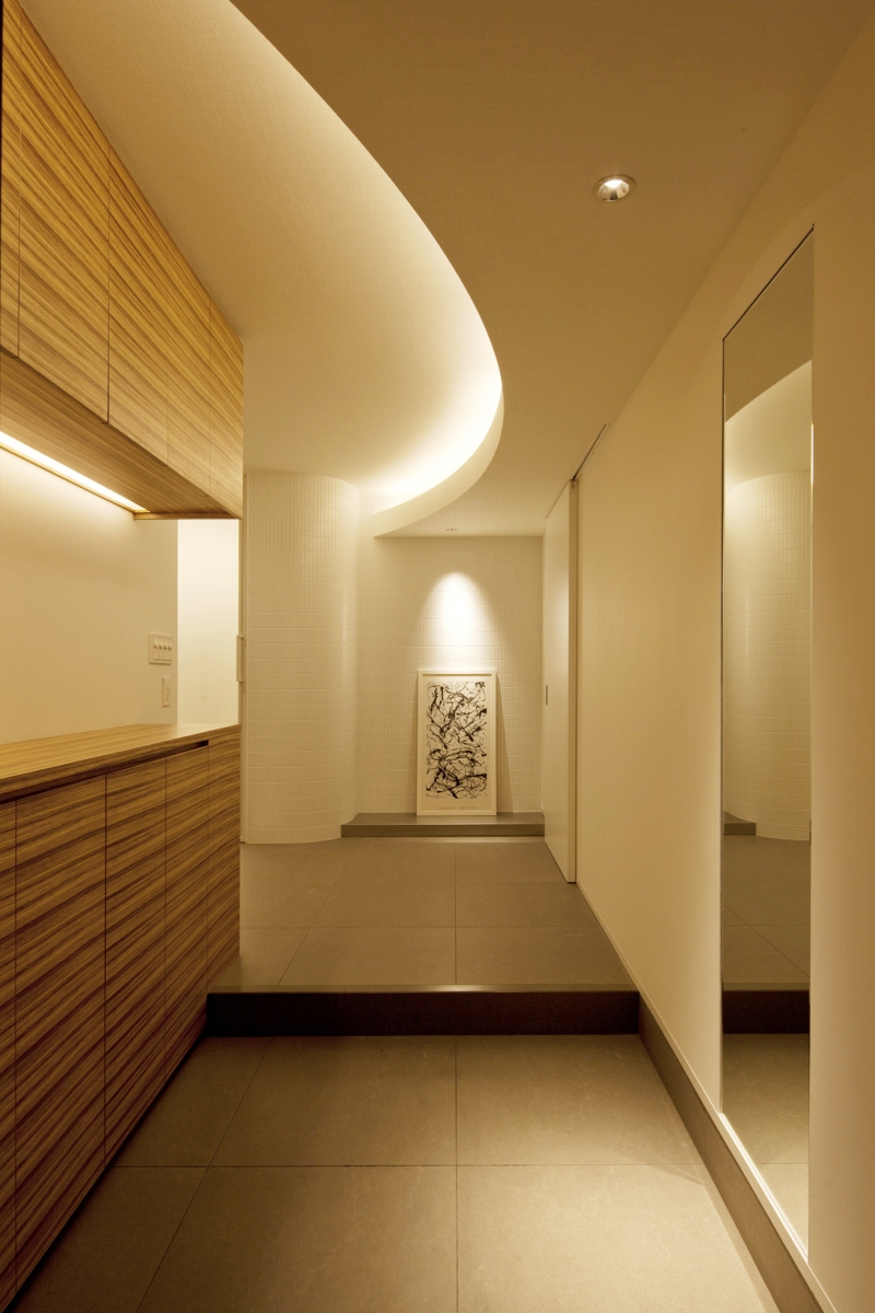 凹んだ部分に間接照明を入れることで視線を天井や凹んだニッチに集め、視線の距離感をだすことで面積以上の広がりを持たせました。