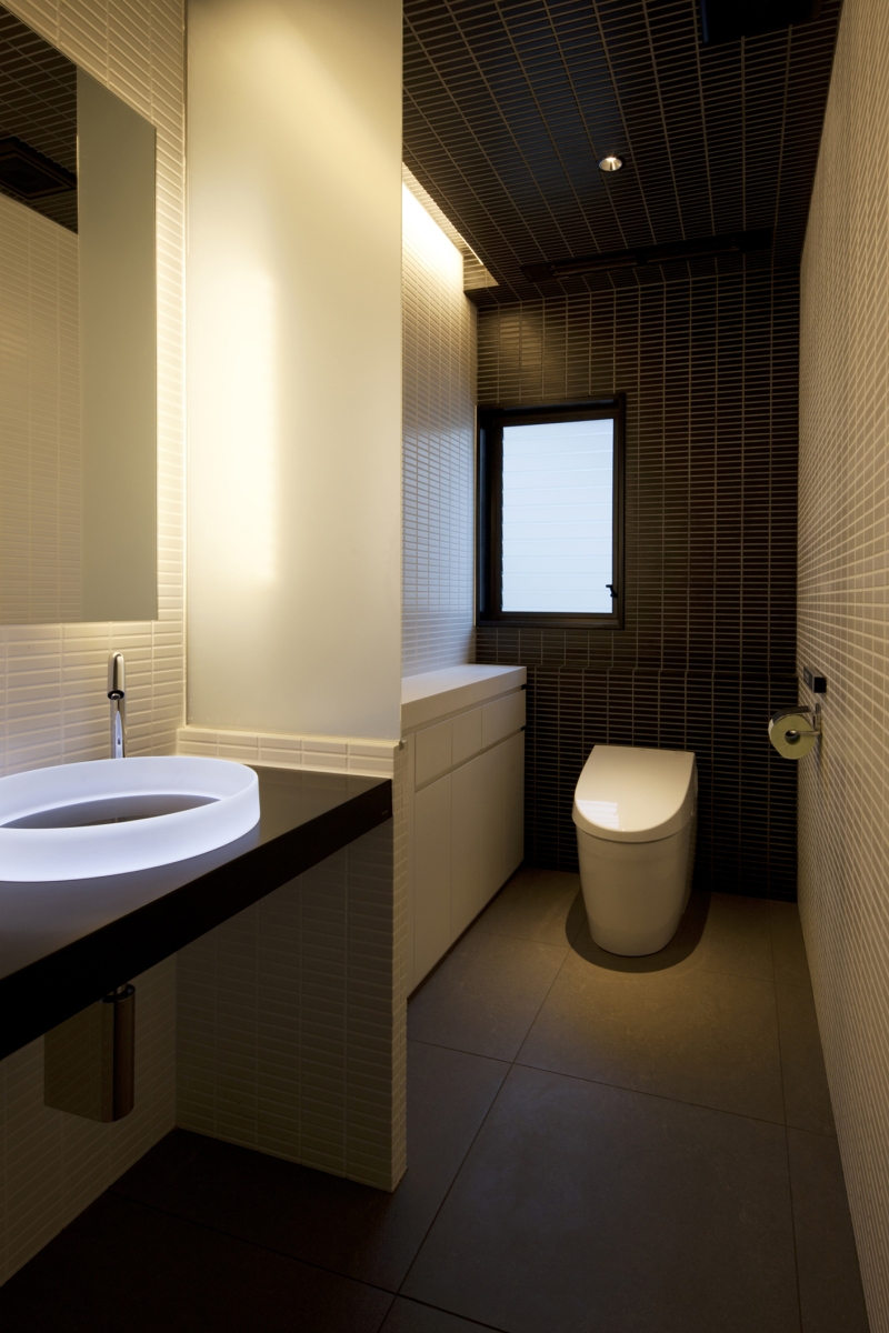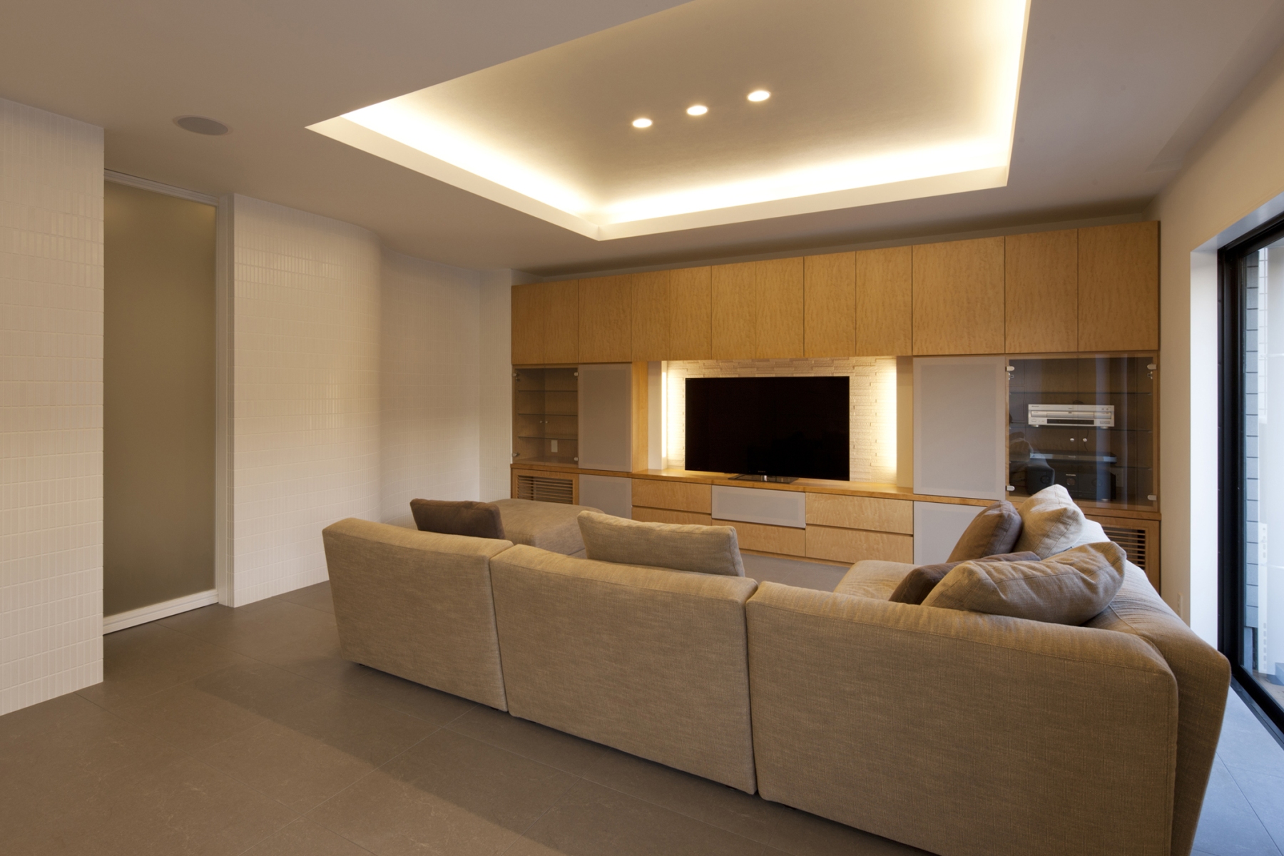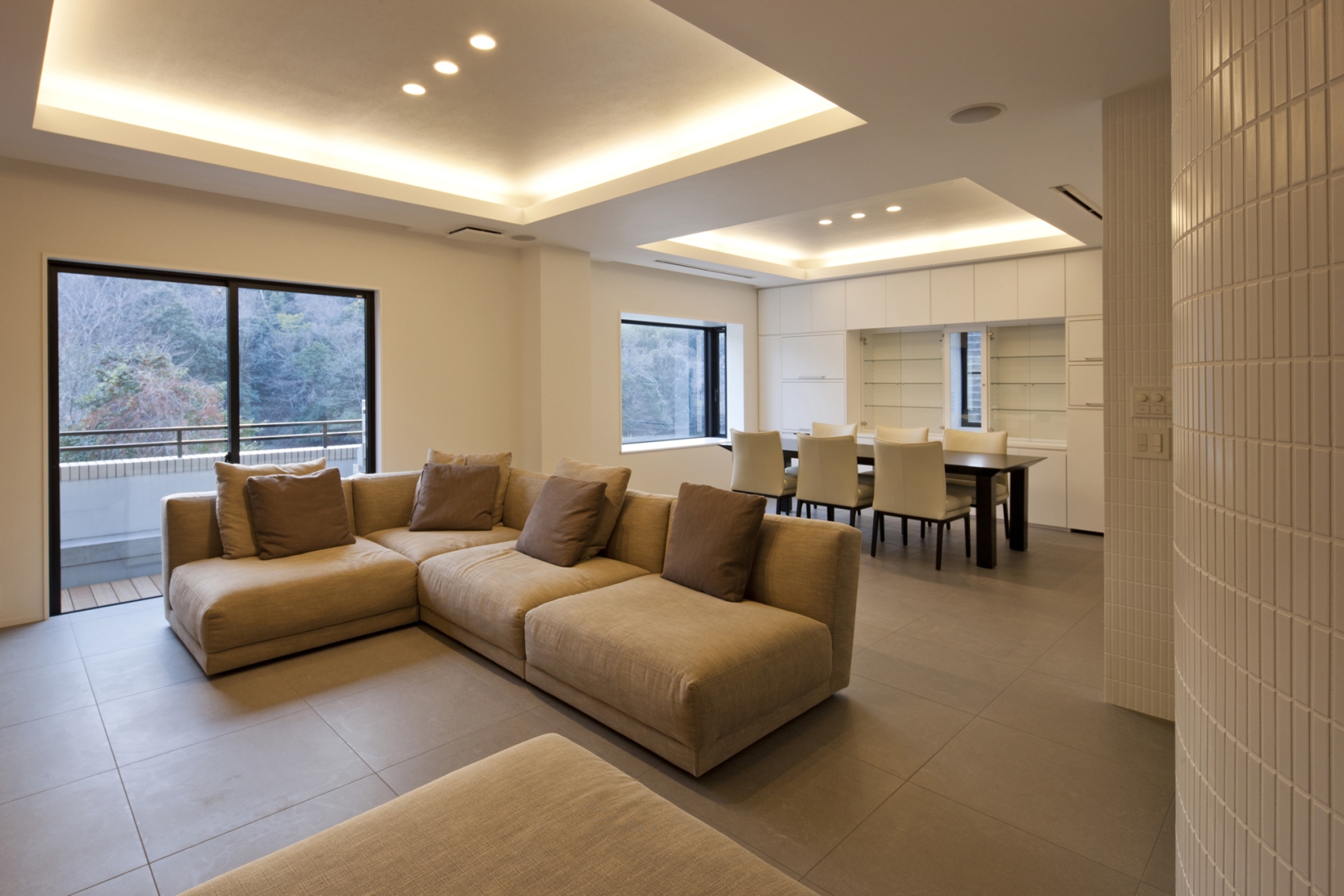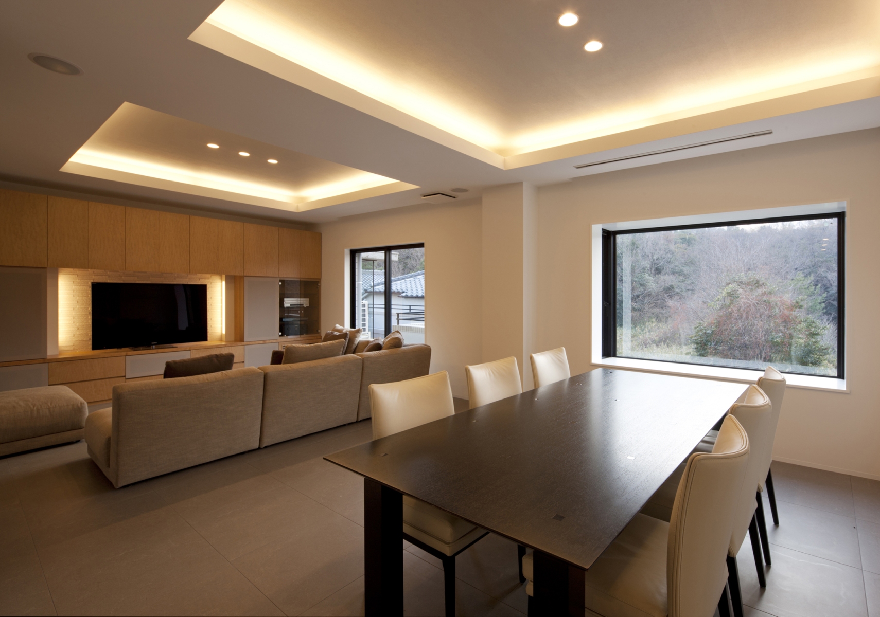 凹んだ部分に間接照明を入れることで視線を天井や凹んだニッチに集め、視線の距離感をだすことで面積以上の広がりを持たせました。