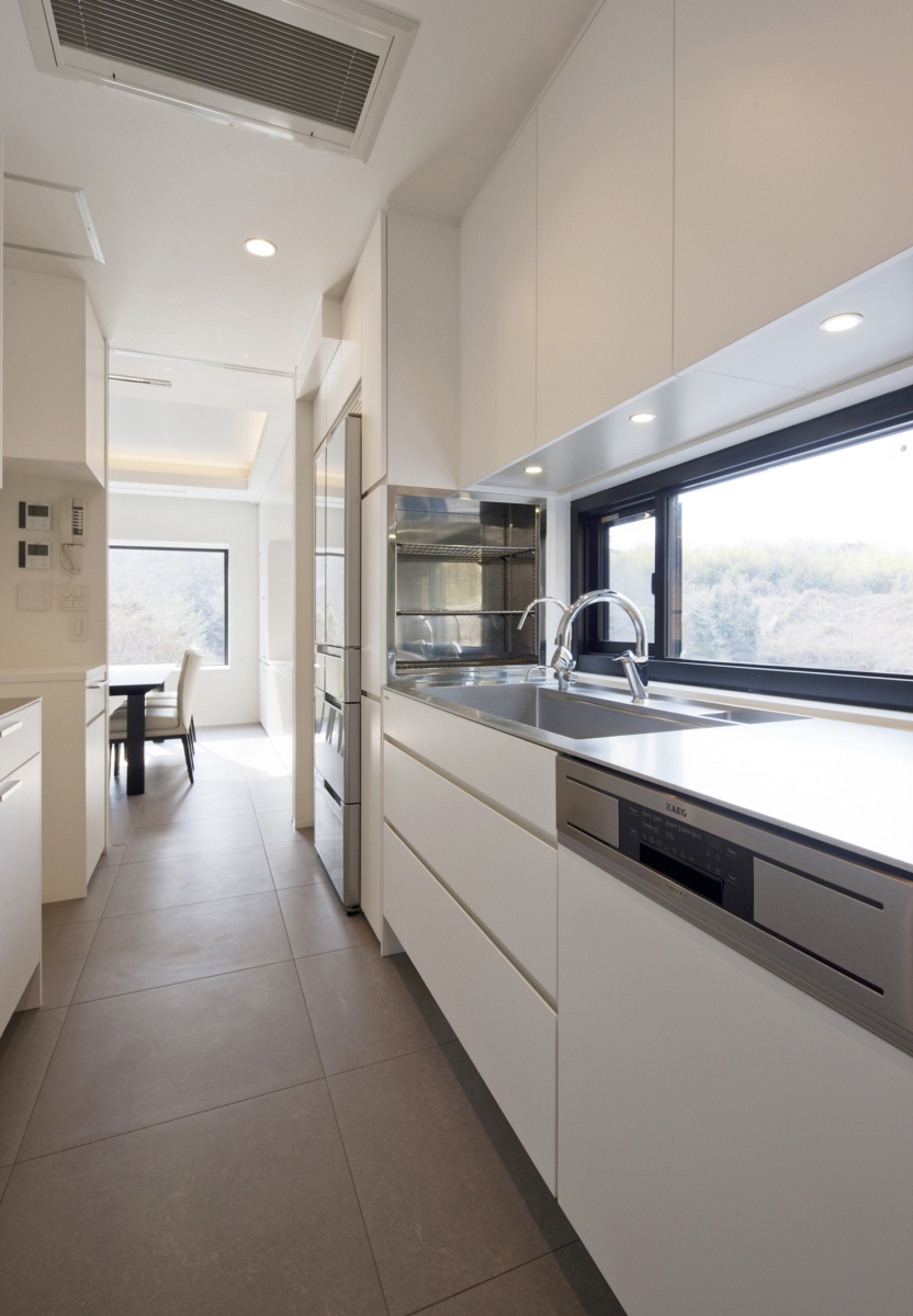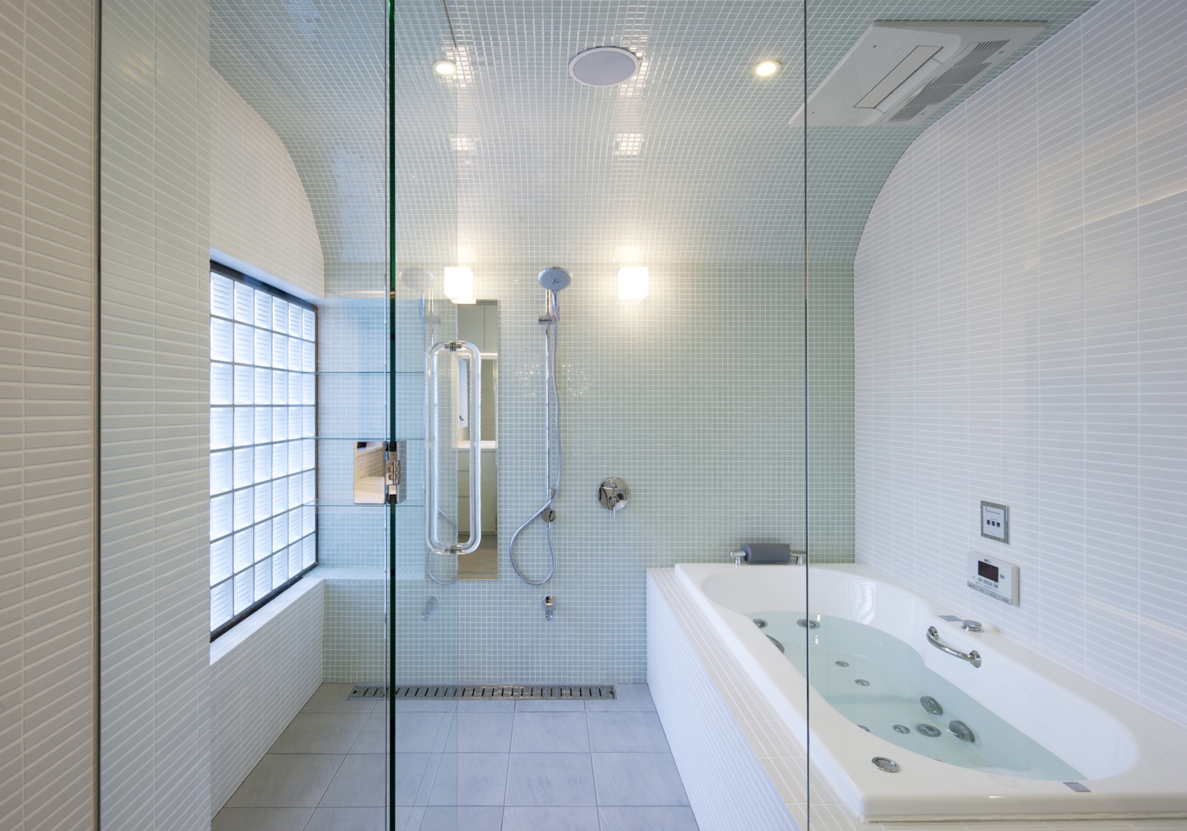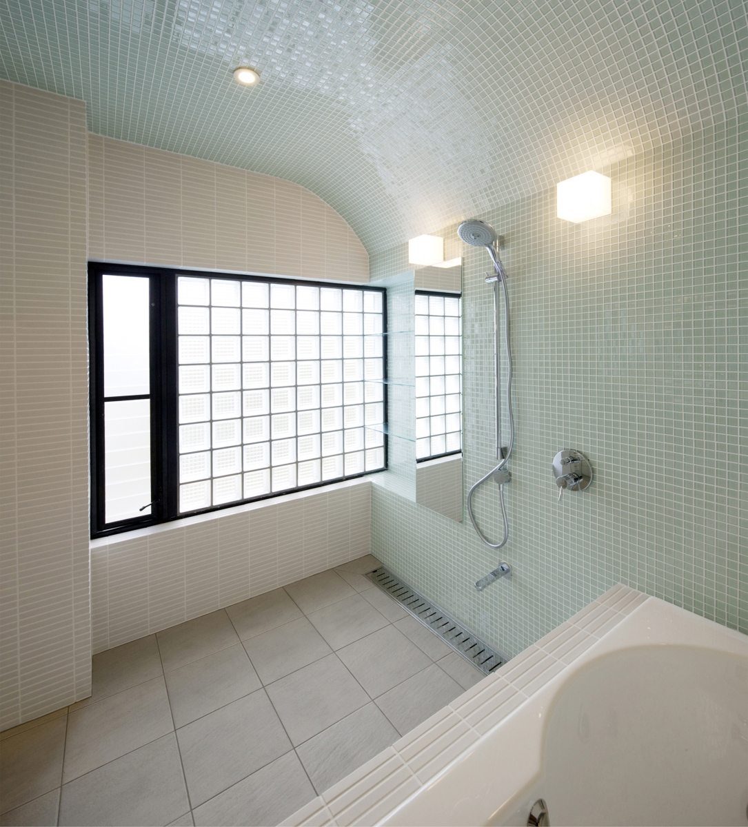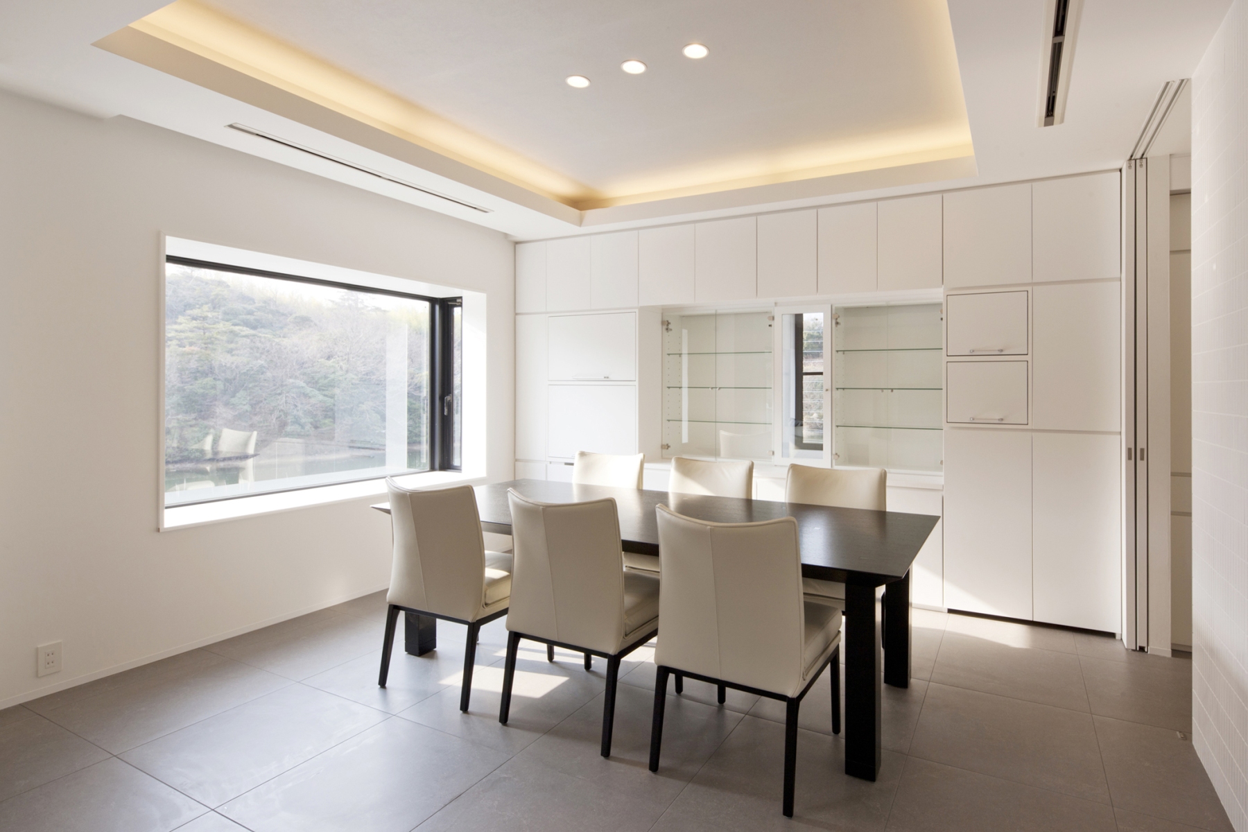 凹んだ部分に間接照明を入れることで視線を天井や凹んだニッチに集め、視線の距離感をだすことで面積以上の広がりを持たせました。