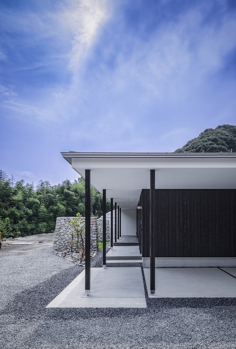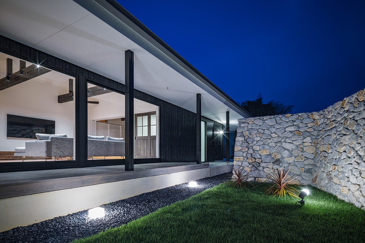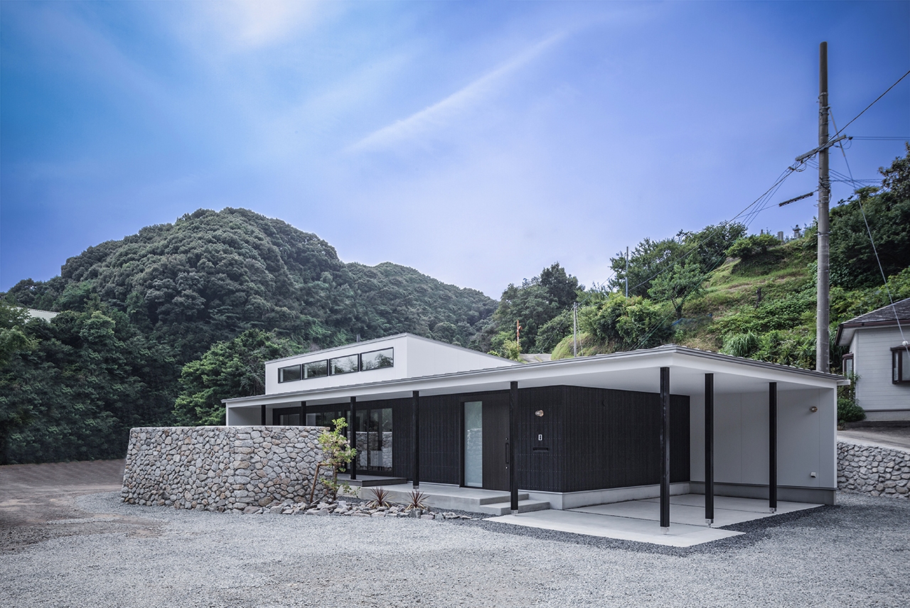 雨風の多い地域性に配慮した、水平に伸びた庇と周囲の自然に馴染むように、焼杉板や石の素材感が特徴的な外観です。