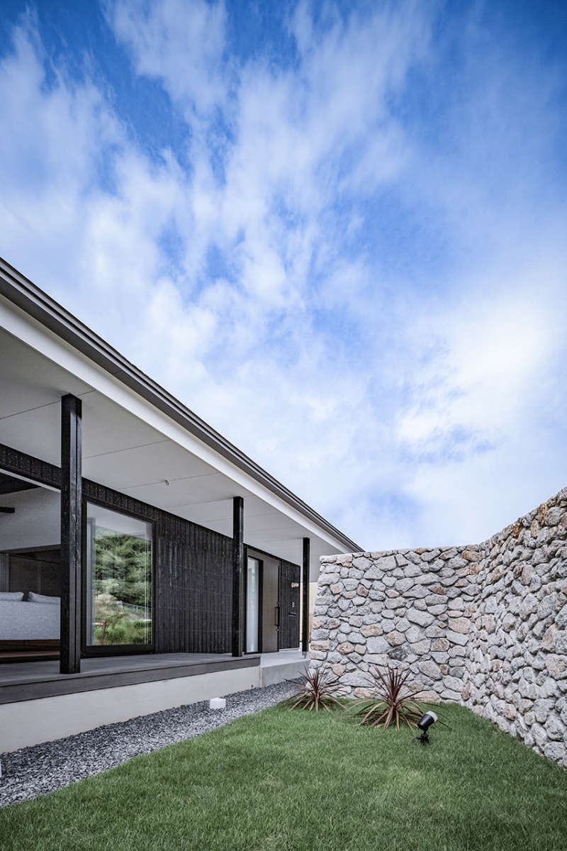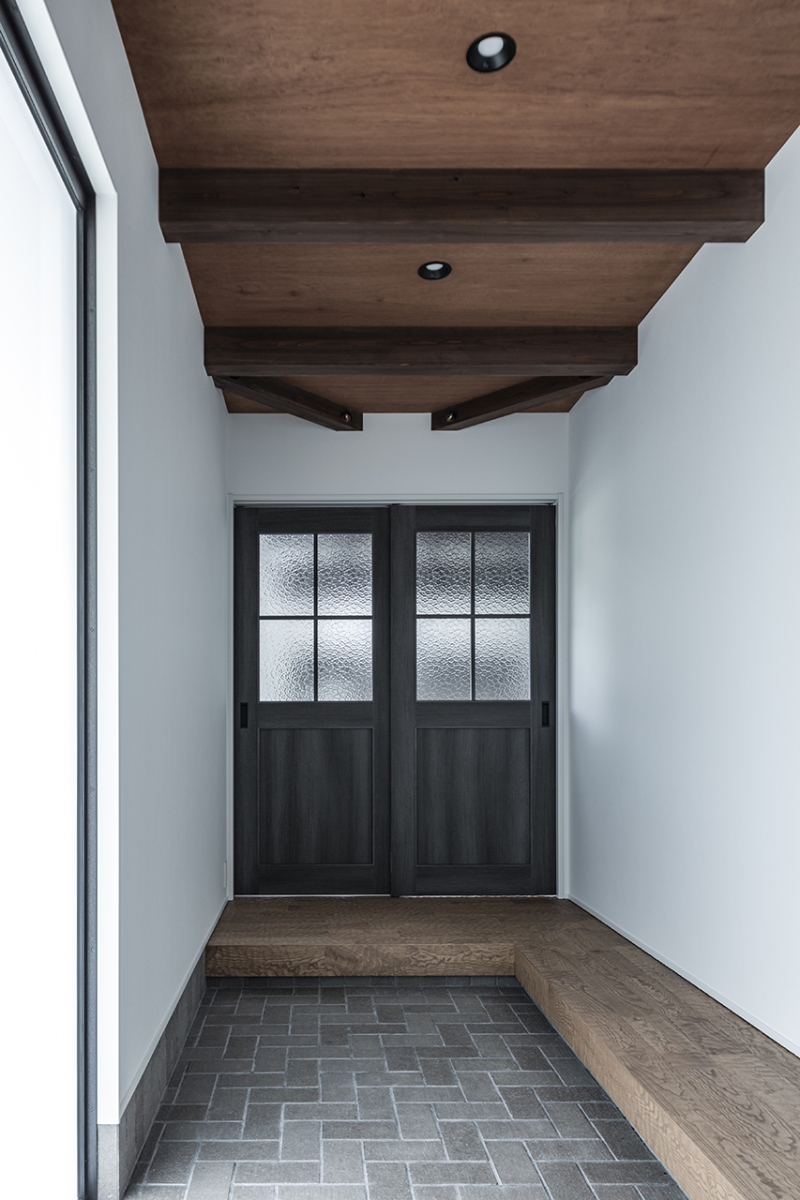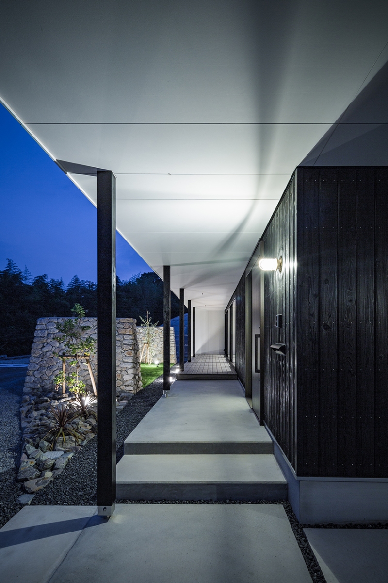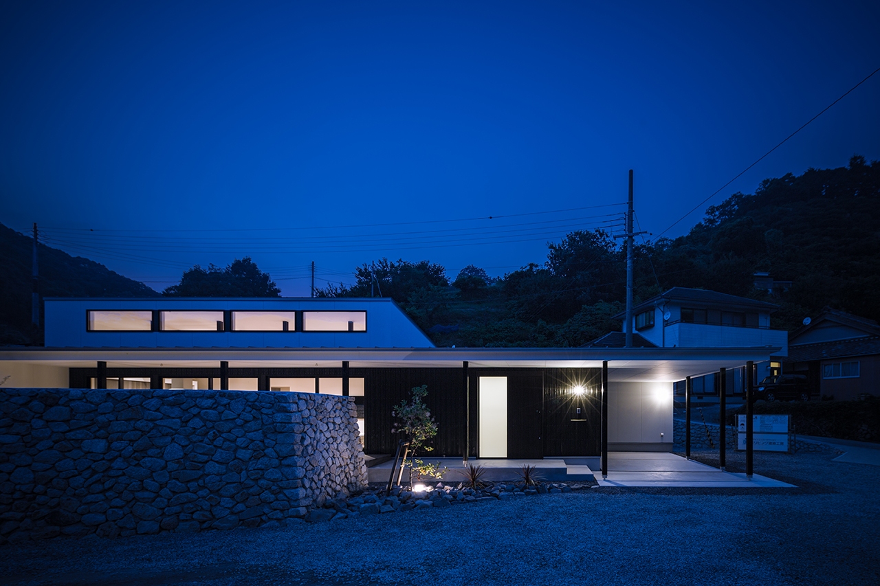 雨風の多い地域性に配慮した、水平に伸びた庇と周囲の自然に馴染むように、焼杉板や石の素材感が特徴的な外観です。
