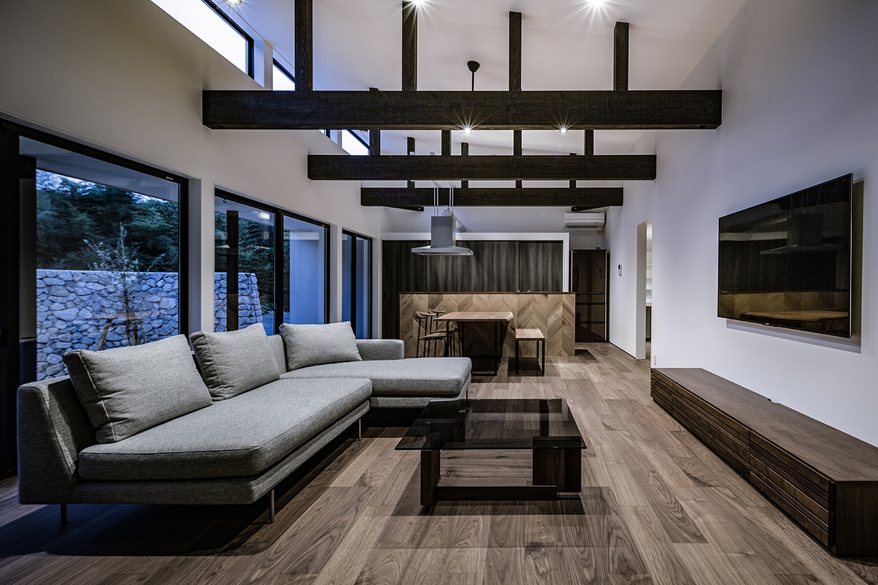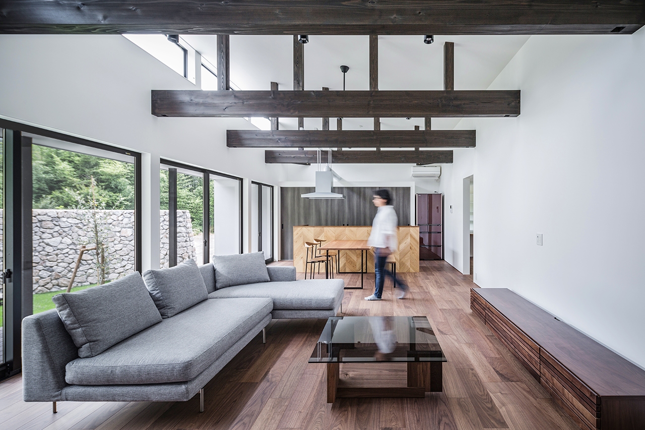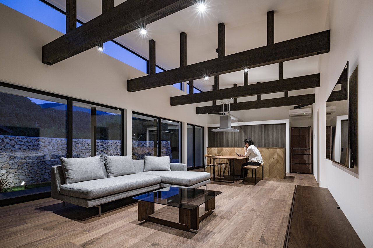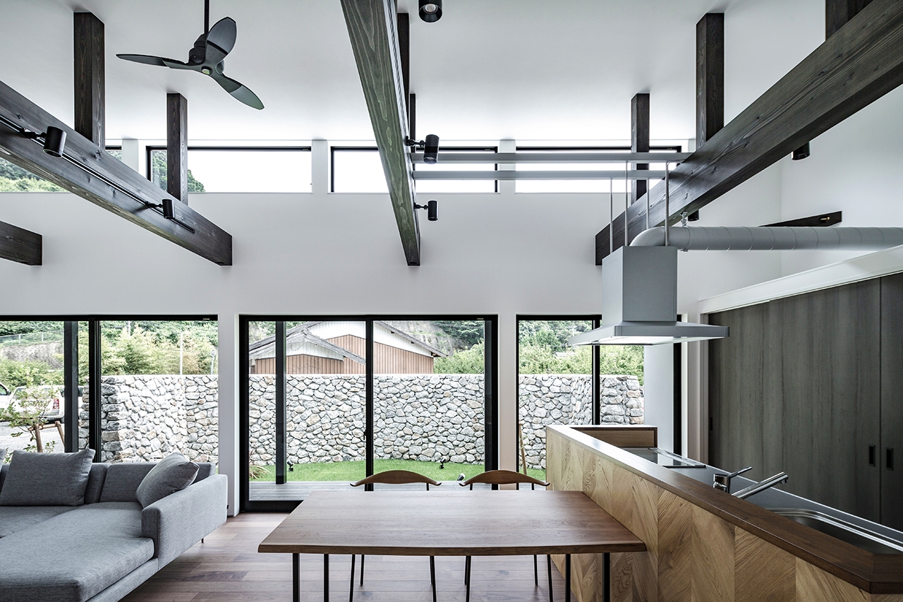 対岸の道路からの視線を考慮し、LDKの南側に半屋外空間の縁側と石塀を設けることで、プライバシーに配慮した明るく開放的なLDK空間を確保しています。