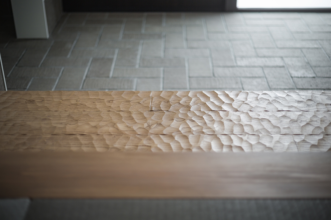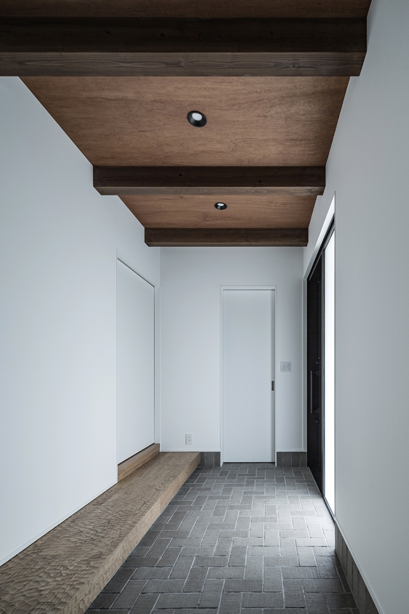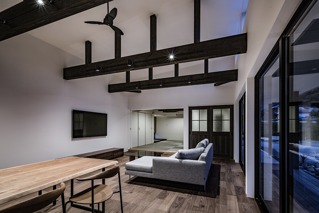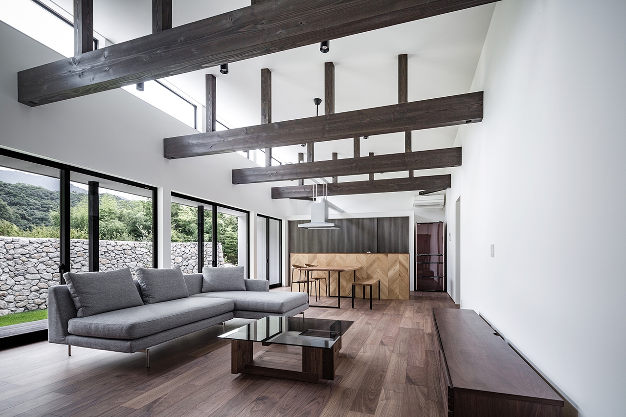 対岸の道路からの視線を考慮し、LDKの南側に半屋外空間の縁側と石塀を設けることで、プライバシーに配慮した明るく開放的なLDK空間を確保しています。