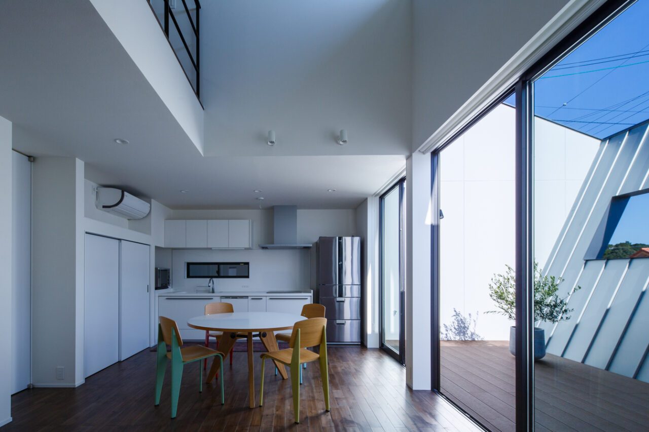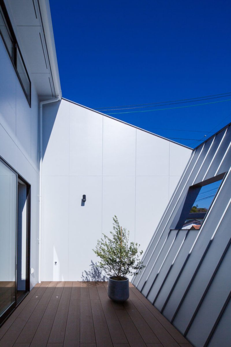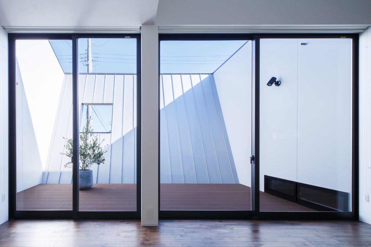 2.採光は将来的に不確定な南側よりも、道路側の開けた東側に中庭を設けて取り入れること。さらに明るさを確保するため、中庭の壁は「斜め」にすることで南の光をより多く集め、 反射板として利用すること。